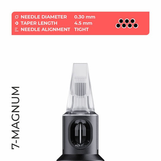The Pro25 7-point Magnum safety needle cartridge consists 7 fine needles grouped in two rows very tight to each other. This makes this needle ideal for creating full shading effect. It delivers more color into the skin, especially for creating consistent shades in bigger areas of the body. You can also use this needle for areola reconstruction procedures.