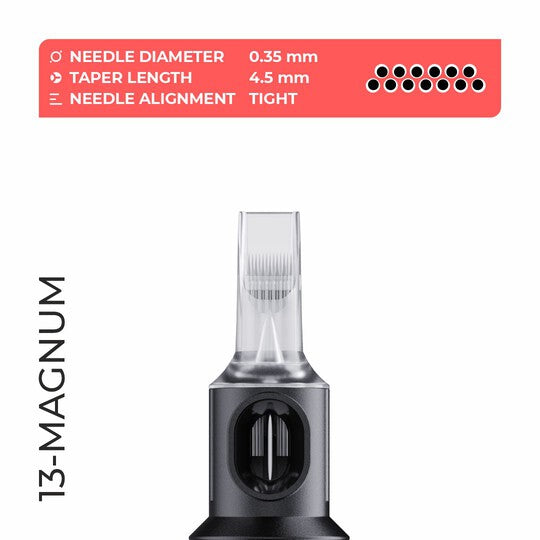The 13-point Magnum Needle is especially suitable for artists who require needles that give maximum color to cover a large area in less time whilst causing less skin trauma. It is the perfect color packer for every zone of the body.