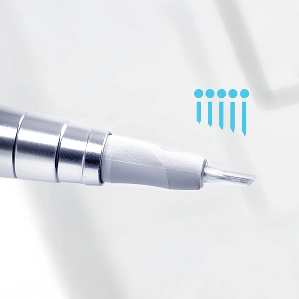 The 5 Point Sloped – Digital Blading PMU needle are flat form comprising, 5 nano needles in a row. Designed especially for digital blading. Creates razor sharp hair strokes and is suitable for all skin types. Suitable for ‘digital blading’ in a somewhat bolder eyebrow. For experienced technicians only.