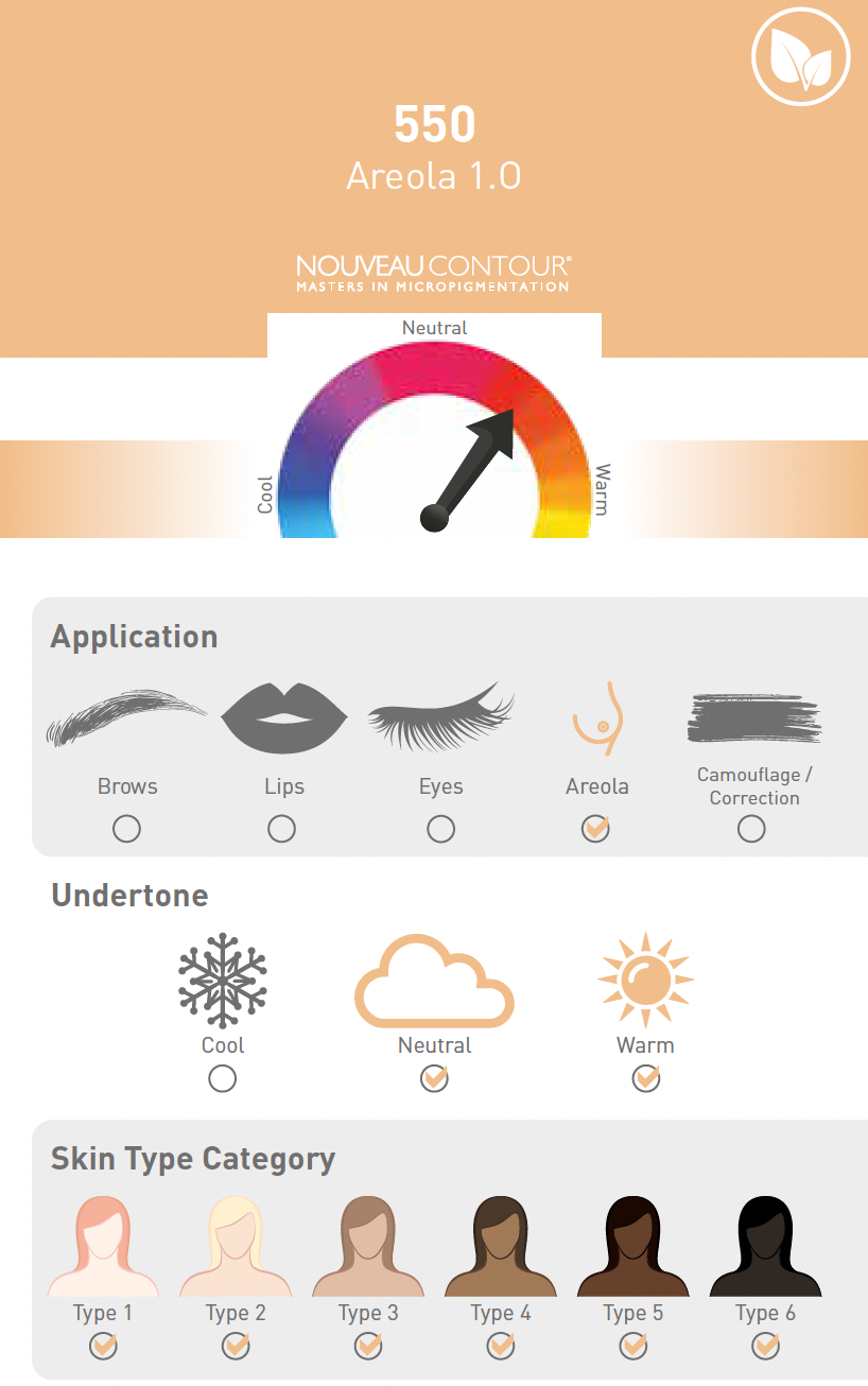 Areola pigment 550 Areola 1.0 is a base color that is made to mix with other areola pigments to achieve the perfect color for clients with a very light skin. Always mix this pigment with another areola pigment, because it’s too light to apply directly.