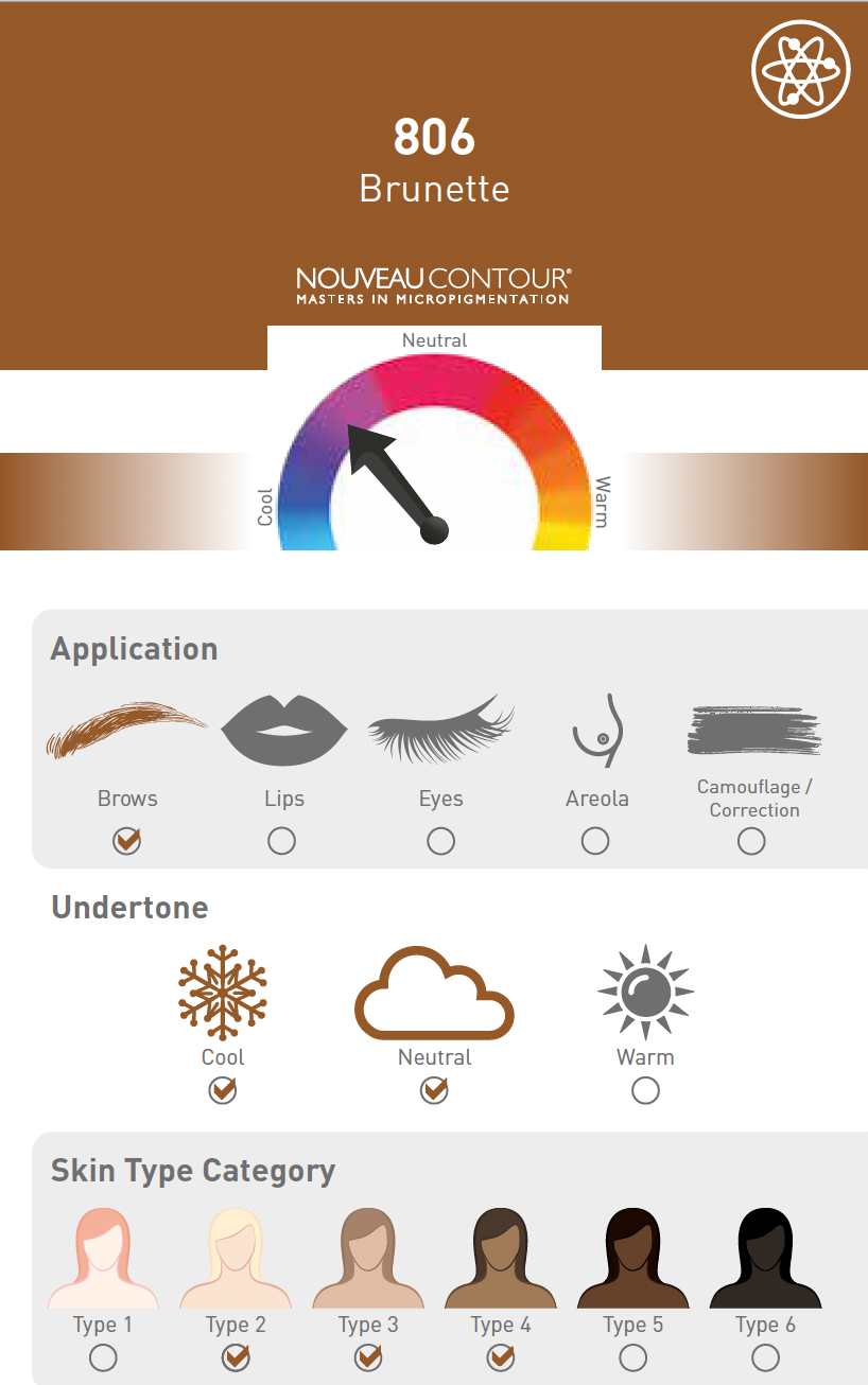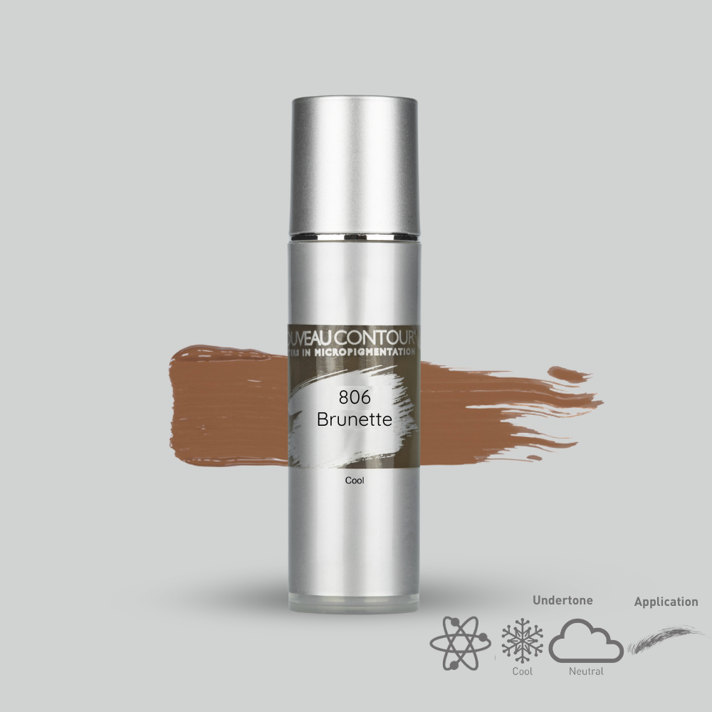 Eyebrow pigment 806 – Brunette is a safe choice for clients that are afraid their brows will be too dark. Thie pigment is suitable for clients with light to light-tinted skintypes and ash-blond or grey hair.